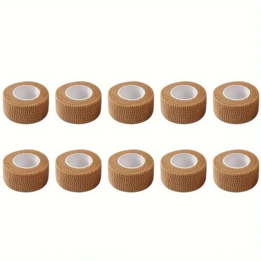 This 10-roll set of elastic bandage tape provides dependable, flexible support for sports, first aid, and everyday use. Each 1-inch wide by 2-meter long roll is made from soft, non-woven material that is breathable and comfortable on the skin. The self-adhesive design allows the tape to stick securely to itself without leaving residue, ensuring easy application and removal. Stretchable and durable, it offers reliable compression and stability for joints, muscles, and minor injuries, making it a practical choice for athletes, medical kits, and home care.